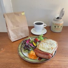 京王井の頭線の浜田山駅の人気の隠れ家喫茶「ou(オウ)」でモーニングプレートとクラシックプリン♡ 9時から11時半まではモーニングプレートが楽しめて、メインのパンはバタートースト、プレーンスコーン、あんバタートースト、チーズはちみつトーストの4つのなかから選ぶ 一番美味しそうなチーズはちみつトーストを選んで、大きなソーセージは外側パリッと中は超ジューシー!濃いお肉の旨みがたっぷり閉じ込められていて…美味しい! サラダもニンジンのグラッセも美味しいし、このお店気にいった٩(๑❛ᴗ❛๑)۶