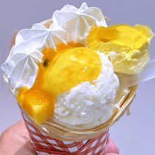 クレープのチェーン店、マリオンクレープの期間限定メニュー、マンゴーパッション。バニラアイス、ホイップクリーム、マンゴーパッションフルーツソース、パイン&マンゴーケーキが入ったクレープ。