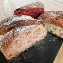 いちごで作られたぶどうたっぷりのパン。生地がいちごの酸味がしっかりあって感動的な美味しさ! いちご←パンの名前😆