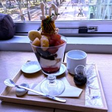 心の月 まめいちの店主が作る和菓子は複雑かつ多様な素材の組み合わせで一般の和菓子の概念を超えたものですが、彼女の創りたいお菓子が上生菓子の枠組みをこえて、もっと自由なものをつくりたいという希望の回答がこちらのお店のパフェなのだと思います。 因みにこちらはコーヒーフルフル寒天をベースに、コーヒー こしあん、ミルクアイスクリーム、マスカルポーネ 生クリーム、グラハムクラッカー、パンナコッタ、ティンプソンとブルー ベリー、ラズベリーソース寒天あわせたものだそうです。