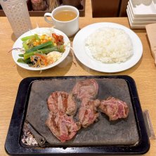 松屋グループのステーキのチェーン店、ステーキ屋松のミスジコンボ。肉汁ビーフハンバーグが250gとミスジステーキが150gがコンボになったメニュー。ハンバーグとステーキの両方が食べたかったら欲張ってこれに。ライス、サラダとスープがセットで付いており、お代わりが自由に出来る。野菜が食べられるのが有難いと感じる自分は、野菜を結構食べて元を取った。