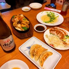 晩ごはんは、中華料理色々。 棒棒鶏。 よだれ鶏。 たたき胡瓜。 鶏肉唐揚げ。 豆苗炒め。 麻婆豆腐。 海鮮黒炒飯。 焼き餃子。 鶏皮餃子。 五目タンメン。 スペアリブ刀剃麺。