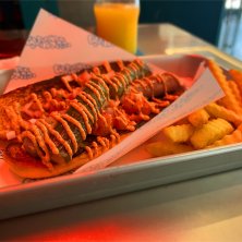 ホットドッグセット ポテト&コールスローセット&オレンジジュース PINKS 自家製のソーセージ オリジナルバンズ ”SLOPPY JOE”(ミートソース) ベーコン チェダーチーズ トマト オニオンのトッピングしたホットドック