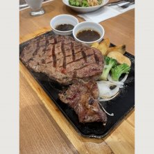 ハンバーグとステーキのファミリーレストランのチェーン店、ビッグボーイの粗挽きビーフ100%大俵ハンバーグ&ビーフカットステーキ。 直火焼きで牛肉の旨味をギュッと閉じ込めた粗挽き牛肉100%を使用した210gの大俵ハンバーグとビーフカットステーキ80gがセットになっており、じゃが芋、玉葱とクレソンを添えたこの店の人気メニューです。ハンバーグは中まで火が通る様に席に到着時に店員さんが目の前でカットして提供されます。ハンバーグの粗挽き感と肉本来の旨味が堪らなくて美味しかったです。