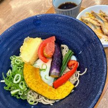 おはようございます\(//∇//)\ 昨日は出社日 少しピークを超えた時間のランチであったことと 午後の打ち合わせまで時間があったこともあり 駅近の方まで足の伸ばしてみました 夏野菜蕎麦、卵添え 鰻丼(ミニ) 一足早めの土用の丑の日気分 流石に昼間は35℃近い気温と、、、 冷たいお蕎麦にしてしまいました 具材はトマト、茄子、オクラ、カボチャ、パプリカ それに温玉と蒲鉾天まで 備え付けの、自家製一味がよく合います さてと、今日もぼちぼちとやりましょうかね〜🔛