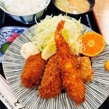ラグビー観戦の前のランチ ミックスフライランチ カキフライ エビフライ クリームコロッケ 唐揚げ 豚汁 プリプリのエビフライ、とろーんコロッケ、大きな牡蠣! もう、最高〜 カウンター席を予約して、ワンオペ店主のライブキッチン見ながらいただくフライは最高です😍