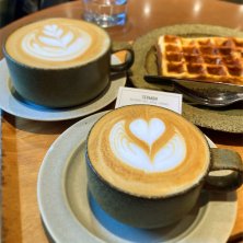 ワッフルモーニング。年末年始もオープンしてるんですね。店員さんもお客さんも楽しそうです。