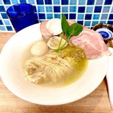 本日2軒目は小伝馬町の『はま家』、メニューはしそ塩そば・ゆず塩そば・牡蠣とあさりオイル塩そば・牡蠣とあさりオイル醤油そば。 注文は券売機トップのしそ塩そば、貝出汁のスープに麺は細ストレート。途中から紫蘇ペーストを混ぜていくと紫蘇の風味が爽やかで美味い。 しそ塩そば 1,000円