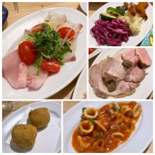 小皿前菜5皿盛り合わせ×2人前 日替わりの前菜小皿が人数分やってくるというメニュー 冷菜3皿は、野菜のマリネとカルパッチョと自家製ローストポーク&鴨 温菜2皿はポルチーニのスップリとイカのトマト煮 ワインが進みますなー