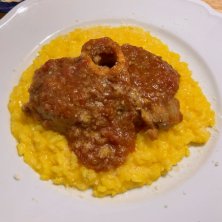 牛すね肉の煮込みオッソブーコ、ミラノ風リゾット添え 真ん中の骨にはいってる骨髄をほじくって(すくって)食べるようにカニフォークがついてきました!