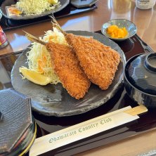 今年の忘年ゴルフは小田原城カントリー。お昼ごはんは全員揃って名物のアジフライを頂きました。