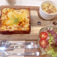 ランチセット ハニーチーズトースト、サラダ、とうもろこしとキャベツのポタージュスープ デニッシュトーストが有名なボロニヤにてランチ🍞 スープのクルトンもデニッシュパン耳✨ 蜂蜜がたっぷりでした🍯お腹いっぱい✨