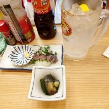 晩杯屋のサービスチケット初めて使った! 今日は煮びたしみたいね。 アジ刺しとともにいただきます。