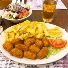 スカンピ&チップス+グリークサラダ☻ ここ美味しいしお店の雰囲気もスタッフも最高だったなー😊 ロンドン旅🇬🇧