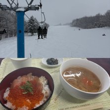 公休ランチ にじますの親子丼 ニジマスの漬けとイクラ、あら汁。どれも激しく美味しいです。ニジマスのイクラはプチプチして濃厚。鮭のイクラと違います。これでスキー場内の食堂なのに800円。街中なら連日行列できそう。