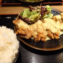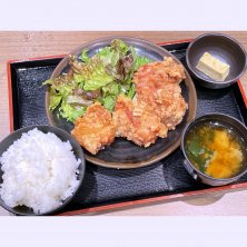 全国に有る若鶏半身唐揚げとザンギの店、なるとキッチンの小樽ザンギ定食。生姜風味に仕上げた鶏モモ肉を使用したザンギにレタスを添えたメインに、御飯、味噌汁と卵焼きがセットになった定食。ザンギは2個、3個、4個入りから選べ、4個入りにした。