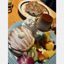 コナズ珈琲でプリンアラモードパンケーキ 固めのプリンも美味しいし、添えてあるフルーツがみんな美味しくってだいまんぞく。