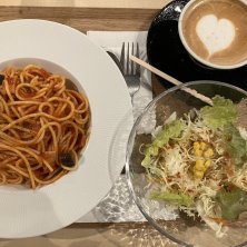 ナスとベーコンのアラビアータ、野菜サラダ、カフェラテ。