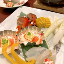 2025.2.25(火) 炭火焼会席 食前酒 柚子酒 先付 湯波琥珀寄せ 前菜 茹で野菜バジル和え・合鴨燻製・海老芝煮 あかにし貝串挿し・若竹ふくさ焼き お造り マグロ・ニジマス・湯波 鍋 栃木県産牛のしゃぶしゃぶ 炭火焼 河豚・帆立ホイル焼き・栃木県産野菜 金山寺味噌・柚子塩 揚げ物 海老鹿の子揚げ・ライスペーパー春巻き 留椀 なめこ赤出汁 食事 湯波ご飯・香の物↓