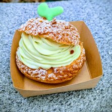 メロンシュー 道の駅常総にいます メロンクリームの中に甘いメロンがゴロッと入っていて美味しかった🍈 上の枝はチョコレートです