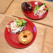 レモンのドーナツで朝ごはん 美味しい♪ 娘微熱〜。1日大人しく過ごしてもらって、夜には回復して欲しいものです。明日は夫もいなくて、自分も遠方へ行かねばならず、保育園に行ってくれると助かるんだけど…。体調はそんなに自由には行かないよね。
