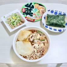 休日の朝ごはん😃 北海道土産の乱切り山菜そば+お餅😋 磯辺餅&ブロッコリースーパースプラウト納豆😋