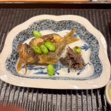 赤石川の稚鮎 茗荷の黒胡麻金平、地物枝豆、おろし胡瓜と天然クレソン