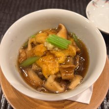 県産ポルチーニ、原木椎茸、キノコ、椎茸風味の豆腐。ウニとミツバ、生姜を。