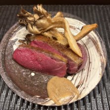 新郷村の鴨、玉ねぎ炭火焼き、天然舞茸、イチヂクソース