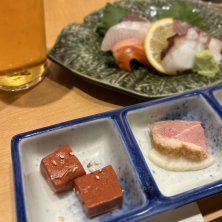会社の飲み会 お刺身盛り合わせ 刺身が厚切りで、日本酒がススム😌