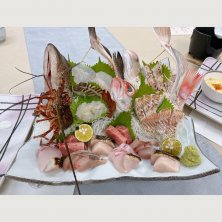 刺身盛り合わせ オオモンハタ・白甘鯛・ノドグロ・伊勢エビ クエ・マグロ・シマアジ・サワラ お刺身を追加注文したら、えらいことにー😂