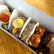 先日、雨が降っていたので2人しか並んでいませんでした。 その前に行った時は、買おうと思っていた1番シンプルなI'mドーナッツがsold outになっていたので諦めましたので、この日は5個買いました。 生フレンチクルーラーを初めて買いましたが、これ美味しすぎました。 娘と絶賛でした…シュガーが少しアイシングしてありますが、甘すぎず美味しいですよ。 この日はクリーム系は買わず、シンプルなものだけ。 買ってすぐに、雨をしのげるビルの中で頬張りました。 これが1番美味しい食べ方なので〜。笑