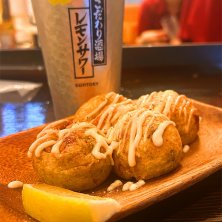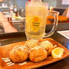 塩レモンマヨ 角ハイボール ふわトロなタコ焼きは塩レモンでサッパリ 中の刻み紅生姜がアクセントで タコしっかり