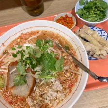 タイ式トムヤムラーメン、パクチー・茹で鶏・生唐辛子追加🇹🇭🍜🐔🌿🌶️ バンコクの屋台で人気という、赤くないトムヤムラーメンです 野菜補給にパクチー、タンパク質補給に茹で鶏、辛さ補給に刻んだ唐辛子を追加しました✋ 途中から卓上の唐辛子酢とナンプラーに砂糖少々加えて味変しました✨