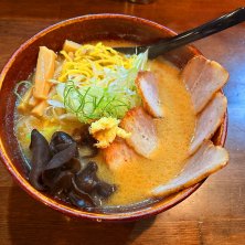 味玉入り味噌らーめん、1,100円。 表面がラードで覆われた熱々濃厚なスープとサッポロラーメン王道の中太縮れ麺。 炙りチャーシューの他に、長ネギ、玉ネギ、モヤシ、メンマ、キクラゲ、すりおろし生姜など具沢山。 味玉も中がとろりと半熟でこれまたうまし。
