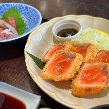 サーモンのレアカツ定食。何をかけて食べるか悩ましいところ。