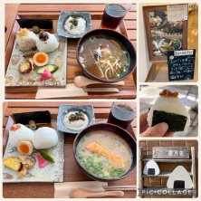 2025.11.08 ランチ 銀月舎 おにぎりとお味噌汁 テラスはワンちゃんOK オープン直後すぐに満席で人気のお店 角煮味噌汁とおにぎり🍙 鮭酒粕汁とおにぎり🍙