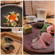 天ぷら以外のおつまみもあります サワラの白子ポン酢 稚鮎とレモンバームの春巻き おつまみ四種盛りはホタルイカ沖漬け、空豆豆腐、鴨、サワラ炙り サワラの白子は初めてたべたかもー! おつまみ盛り合わせもお酒進みました 久々日本酒頼んじゃった