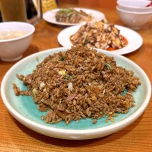 よだれ鶏 にんにくの芽と豚肉炒め 生ビール 海鮮焼そば 五目チャーハン 杏仁豆腐