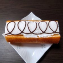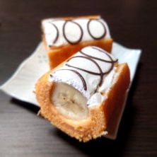 たかだまバナナの断面 ソフトバウムの中にカスタードクリームとバナナ。