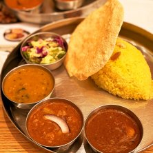 南インドカレー屋さん この盛り付け、カッコいい〜👍 3種類のカレーを選べる ・豆とほうれん草のカレー ・マラバール風キーマカレー ・エリックチキンカレー