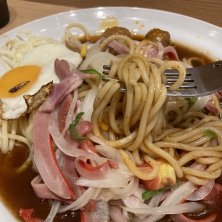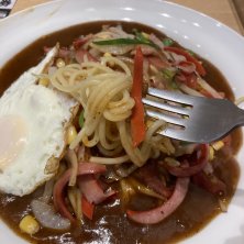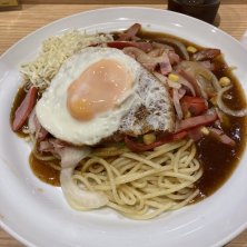名古屋飯にあんかけスパゲッティ〜🍝 いつものミラカン目玉焼きとチーズトッピングに6月にもらったサービス券でミートボールもトッピング。 今日も大変美味しゅうございました😋 11月まで有効なサービス券もらったからまた来なきゃ〜🤣
