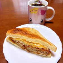 昨日のラーメン屋さんのとなりの お惣菜屋さんで買ってきた メンチチーズサンド🥪 冷蔵庫入れてたらメンチカツ冷え冷えなので トースターで焼きました😊