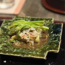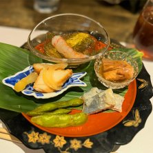 松陰神社前駅「松蔭鶴水」 お昼の4000円ミニコース 1ドリンク付き ドリンク2杯目からは1杯500円 八寸 ボタン海老と茄子 ジュレがけ 枝豆蟹醤油つけ クエ南蛮漬け など
