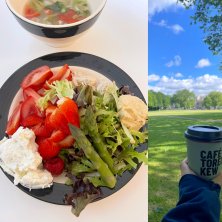 London 飯 旬のもの色々載せサラダ フムスとリコッタチーズ添え キッチンがちいさく茹でる以外の調理がむずかしい そんな言い訳をよういして 日々簡単ご飯 この日は夫と息子が公園で遊んでくるてる間に久々のThames ランをさせてもらいました 楽に走れる、気候が良い