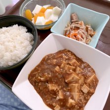 病院食日記14日目 夕食 麻婆豆腐、ビーフン炒め、杏仁豆腐
