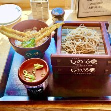 本日の麺ランチ✨ 穴子天丼&ざる蕎麦定食❣️ 一本穴子に甘いタレ+ざる蕎麦2枚😄 サクサク衣にしっとり穴子❗️に 香り豊かな、石挽き蕎麦が、niceバランス👍 美味しく頂きましたー😋