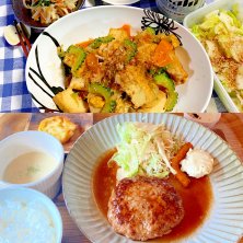今日のランチ&晩ごはん♪ ☆ハンバーグ定食 ☆厚揚げゴーヤチャンプル〜 ☆もやしのナムル ☆とうもろこしの天ぷら ☆白菜の漬物 今日は、用事で母と出かけていたので、 お昼ついでに、初めて入るカフェで、ランチ♬ 自家焙煎の珈琲も美味しく、 ハンバーグも、手捏ねで、柔らかくジューシーで美味しかったψ(๑´ڡ`๑) お昼しっかり食べたので、夜は控えめにしようと思ったけど、またゴーヤチャンプル〜♡ 今回は厚揚げバージョンで、ガッツリご飯にビール飲んじゃった〜(*´艸`*)
