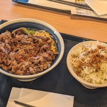 火曜公休ランチ 焼きたてのカルビ丼、肉増し、サラダ、王道カルビラーメン(小)セット 最近よくインスタに広告が出ていて、母の生活している場所から近いので来てみました。 廃れた昔の丼チェーン店にも似たメニューですが、店内広くて綺麗で、コスパも悪くなくなかなか良いです。