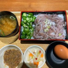 イカ姿重とゲソ天 イカづくし〜🦑 温玉に肝醤油をかけて、いただきます👍 ウマウマ😋